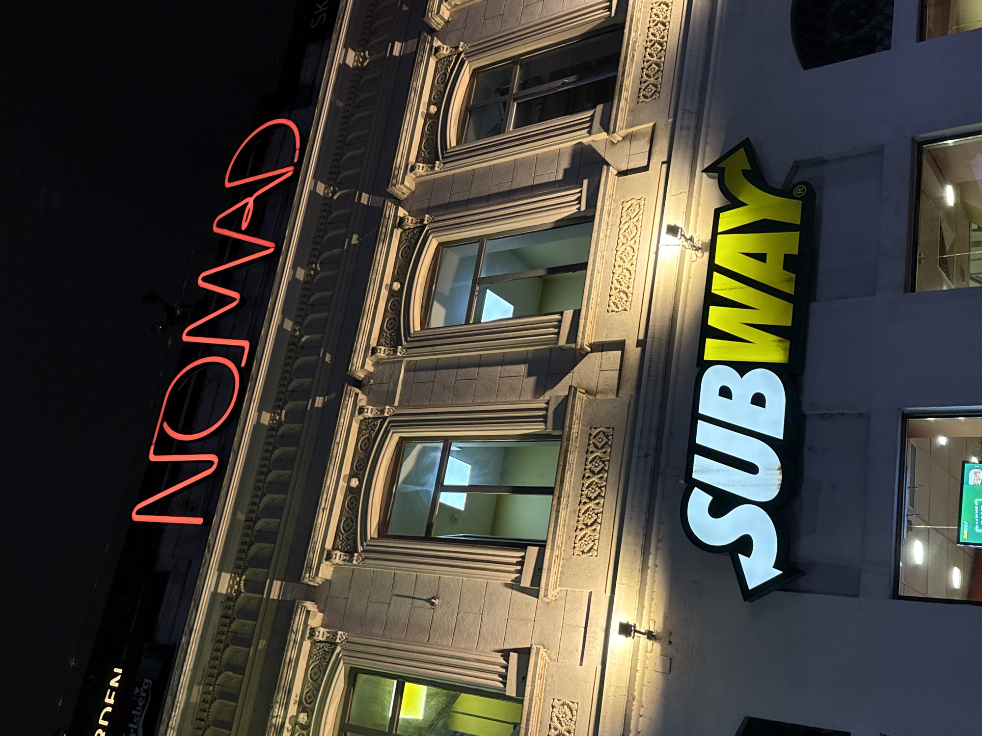 multi-story building at night in Bucharest, Romania. The words "NOMAD" in bright red neon lettering are visible on the left side of the building. The right side of the building features a Subway restaurant sign. The building has ornate architectural details around its windows. The photograph is taken at an angle, looking up at the building. There are no visible people in the frame.