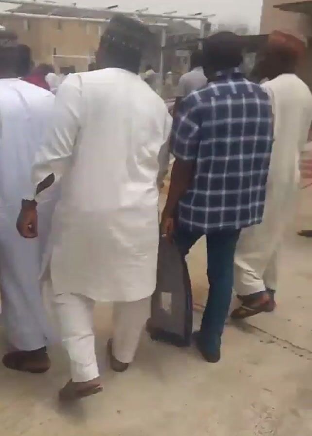 A group of men are walking outside a building with a sign that reads "Abu-Haneefah Islamic". The men are dressed in various clothing styles. Some are wearing traditional white robes and caps, while others are wearing casual shirts and pants. Some of the men are carrying prayer rugs. The ground is concrete. The sky is overcast. The camera follows the group of men as they walk.