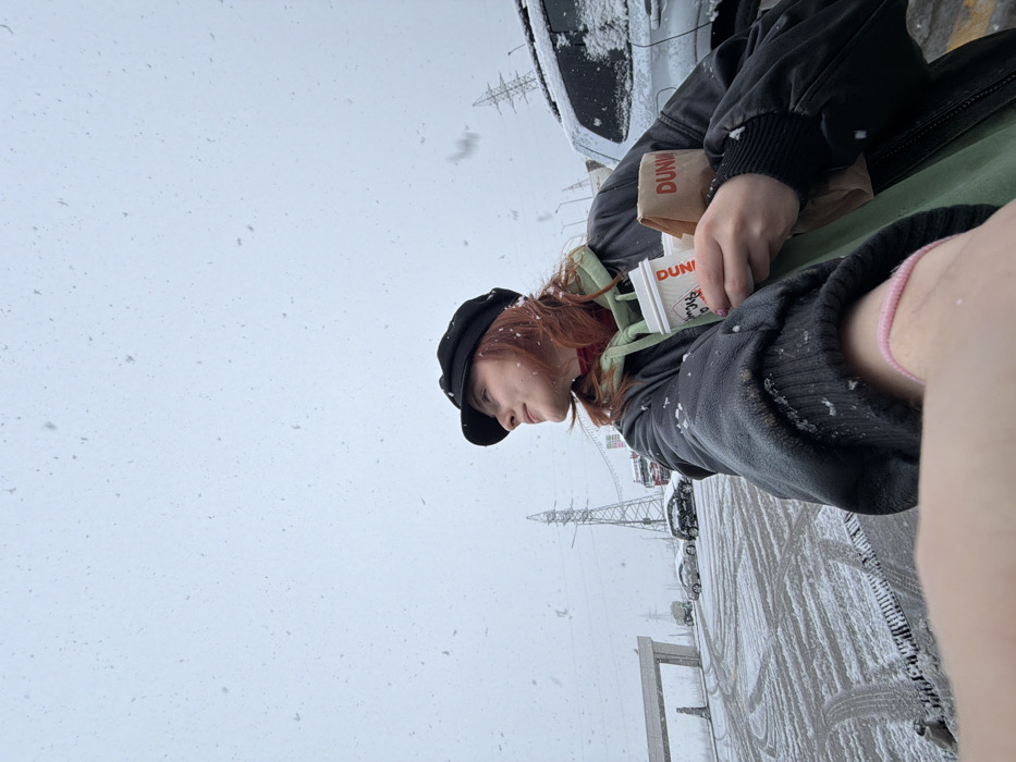 A female subject is depicted from a close, low angle in an outdoor environment in Argveta, Georgia, experiencing snowfall. The individual, with reddish-brown hair, wears a black flat-brimmed cap, a black leather jacket, a light green hooded sweatshirt, and a red garment visible beneath. Her head is slightly tilted, and she looks upwards and to her left with a faint smile; snowflakes are visible on her attire and hair. In her right hand, she holds a white paper cup and a brown paper bag, both marked with 'DUNKIN'' branding. A pink bracelet is on her right wrist. The ground is a paved surface, partially covered by snow, displaying numerous tire tracks. The background features a large, grey, rectangular archway structure on the left, several snow-covered vehicles, and a prominent metal lattice transmission tower. The sky is uniformly overcast and light grey, with falling snow visible throughout the frame.