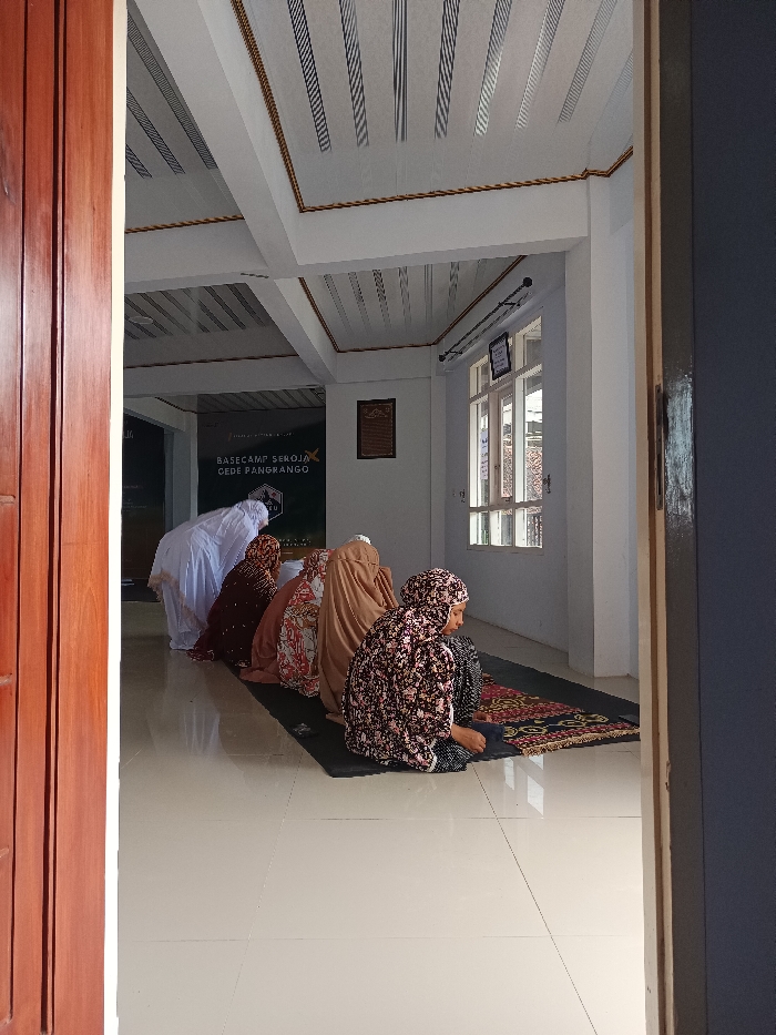 The image depicts an interior scene, viewed through a doorway, at a facility identified by a banner as "BASECAMP SEROJA CEDE PANGRANGO" in Gunung Putri, Indonesia