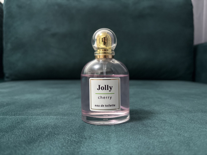 A bottle of "Jolly Cherry" eau de toilette sits on a textured, dark teal surface, likely a couch or chair