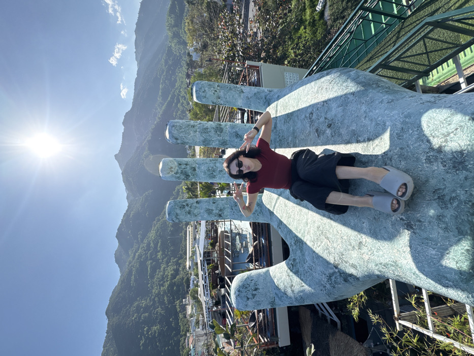 A female subject, appearing to be in her 20s or early 30s, is seated on a large, light blue-grey concrete sculpture resembling a human hand. The sculpture features four fingers and a thumb, extending upwards. The subject is positioned on the palm section, facing the camera directly. She wears a dark red short-sleeved top, black wide-leg pants, black sunglasses, and light grey platform slide sandals. Her hands are raised to the sides of her head, each forming a "peace sign" (V-gesture). A tattoo is visible on her left forearm, and she wears a dark-colored smartwatch on her left wrist. The scene is an elevated outdoor viewpoint in Nha Trang, Vietnam. In the background, under a bright, clear blue sky with a prominent sun flare, green, tree-covered mountains rise against the horizon. Below the mountains and behind the sculpture, parts of a city or town are visible, featuring buildings with light-colored roofs and what appears to be an outdoor cafe or restaurant area with multiple structures. Green metal railings and stairs are visible to the lower right and left of the sculpture, indicating an accessible observation platform. The strong daylight casts distinct shadows across the sculpture and the subject.