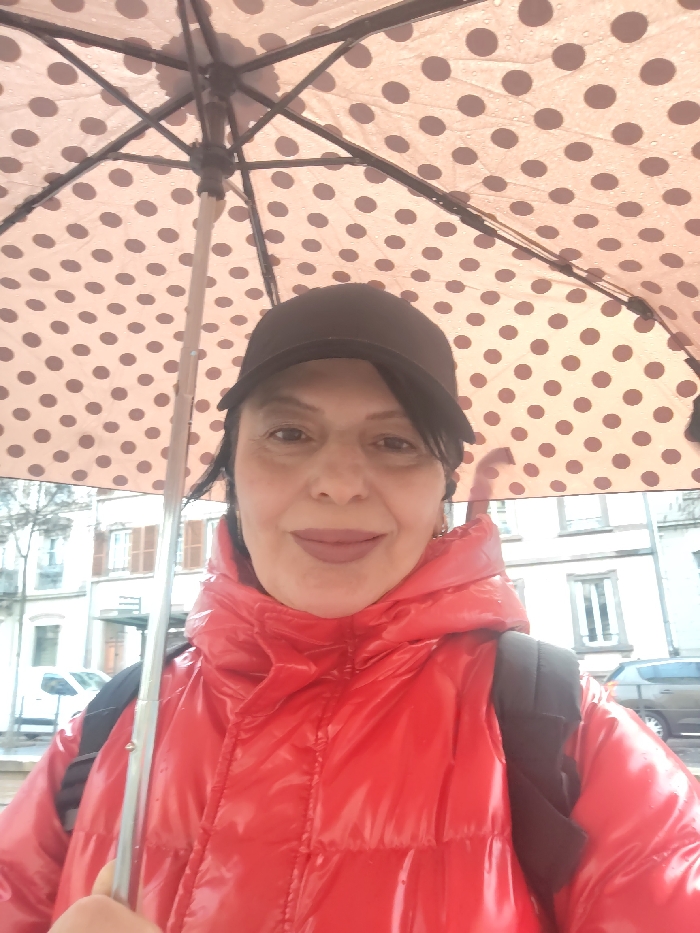 - "A woman with dark hair and eyebrows, wearing a black baseball cap and red puffy jacket, poses under a polka-dot umbrella" by FM-Odse83, licensed under CC BY 4.0