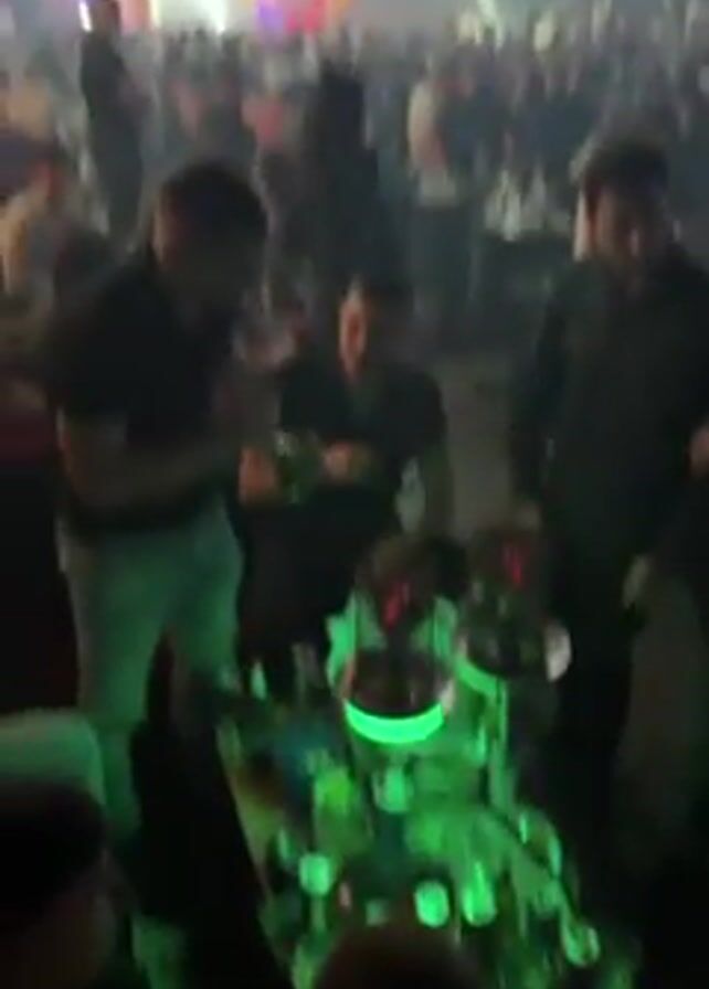 group of people around a table in a crowded nightclub. The table is covered with bottles and several hookahs, lit with green light. People are standing, leaning over the table, and talking. The background is blurred, but other people, tables, and the stage are visible. The stage backdrop indicates “DJ Maximilian.” The atmosphere is crowded and appears to be a social event.