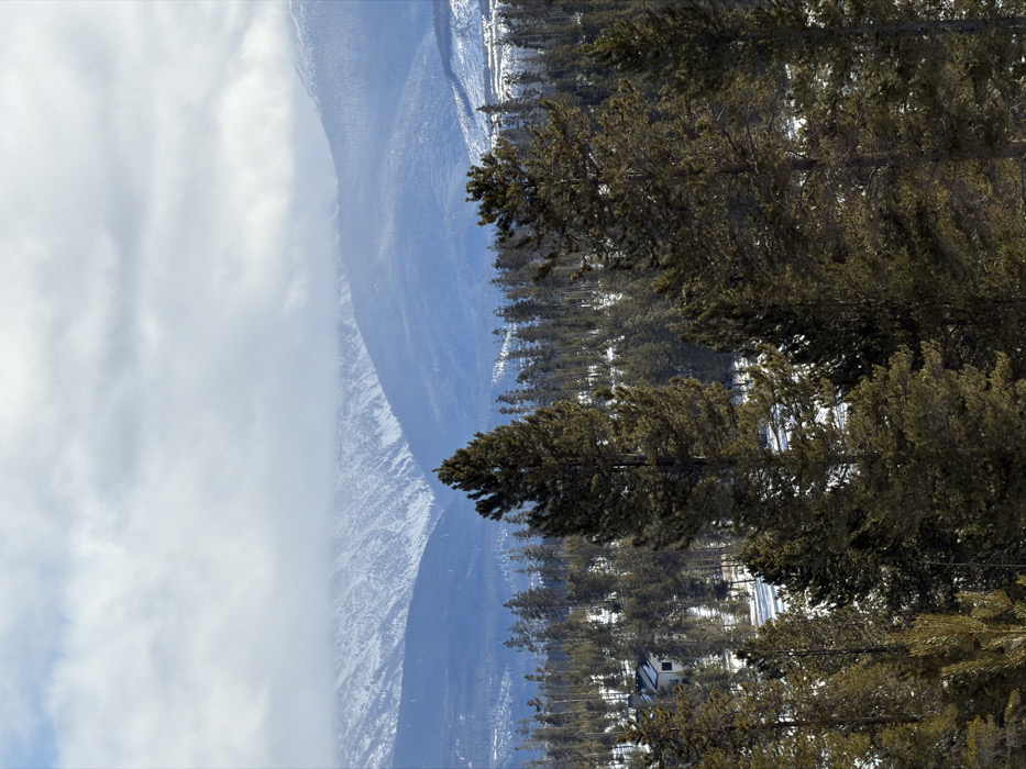 landscape with a mix of natural and man-made elements. Heavily clouded sky to the left contrasts with a mountain range in the background, partially covered in snow. A dense forest fills the right side of the frame, with tall trees dominating the view. In the midground, a small building or structure is visible amidst the trees. The overall scene suggests a remote and mountainous area. The photograph is rotated counter-clockwise.