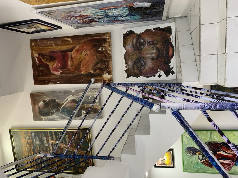 This image depicts an interior staircase within a building in Ikate, Nigeria. The staircase consists of white tiled treads and risers with visible gray grout lines. A metal railing ascends alongside the stairs; its balusters and sections of the handrail are distinctively wrapped with various patterned fabrics, primarily in shades of blue, white, and purple, featuring striped and geometric designs. Multiple artworks are displayed on the white walls. On the upper left wall, a large framed painting portrays an illuminated cityscape at night. Below it, an unframed, vertical portrait depicts a figure with dark skin in a light-colored top, looking upwards. To its immediate right, another unframed, vertical painting features a seated figure wearing a red top and an orange skirt. On the lower right wall, an irregularly shaped square artwork shows a close-up of a dark-skinned face with detailed line work and a symbol on the cheek, signed "Anthonny Nuel." Above this, a partially visible framed artwork is present. On the lowest visible section of the left wall, a green-framed painting depicts a figure in a red and dark garment. No individuals are present in the scene. The overall environment is brightly lit, highlighting the exhibited art and the decorative railing.