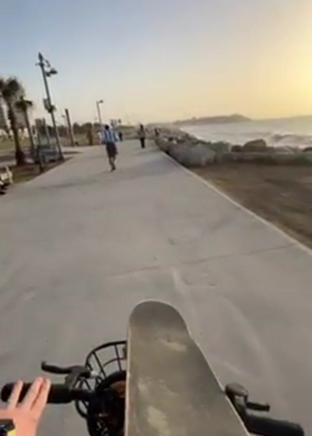point-of-view shot from a bicycle being ridden along a seaside walkway at sunset. A skateboard rests in the basket of the bicycle. The walkway is made of light gray concrete and runs parallel to the ocean. To the right of the path is a line of large rocks separating the walkway from the sandy beach and water. Ocean waves crash against the rocks. Several people are walking along the walkway. The sun is setting over the ocean, creating a golden glow in the sky. Buildings and palm trees are visible on the left side of the path.