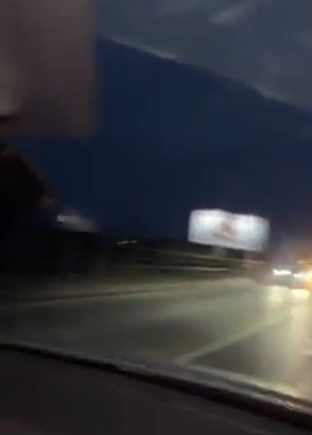 interior of a car driving at night. The view switches from the road ahead to the passenger seat, where a young woman wearing a light brown sweater waves to the camera. She has long, light brown hair and red nail polish. In front of her is a partially opened bottle of green liquid, possibly soda, and a bag of snacks. The woman laughs and makes a peace sign towards the camera. The background music has a dance-club vibe. The car is moving along a highway with streetlights and road signs visible.