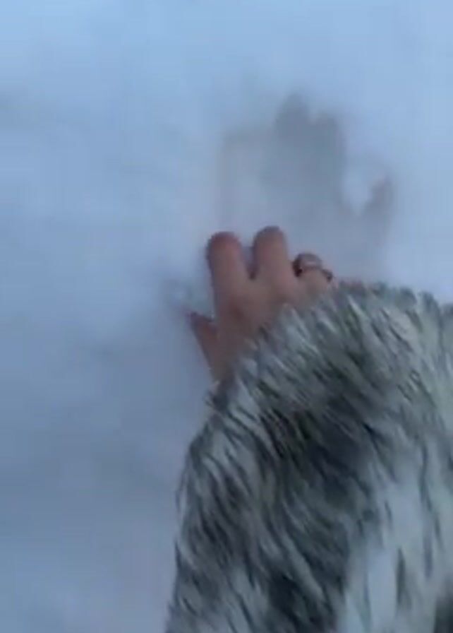 hand wearing a fur coat touching and picking up snow. The hand is adorned with rings and has light-colored nail polish. The scene then pans out to reveal a snow-covered landscape with a few houses in the background. The houses are simple and have a green exterior. There are also some trees and utility poles visible in the background. The sky is overcast, indicating a cold, wintery day.