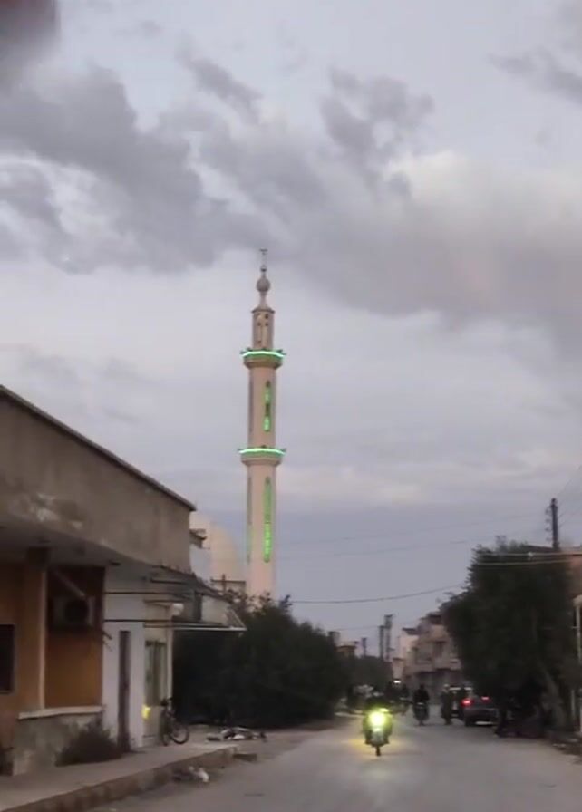 street scene with a mosque in the background. The sky is cloudy and it appears to be dusk. A white mosque minaret, decorated with green lights, stands tall against the sky. The street is lined with buildings, some of which are houses. Several motorcycles with their headlights on are driving down the street. The audio captures the Islamic call to prayer.