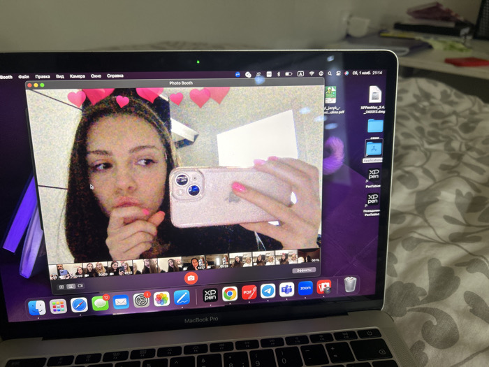 The image depicts an indoor setting in Novosergievka, Russia. A silver MacBook Pro laptop, with its lid open, rests on a light-colored bedspread featuring a dark gray floral or leafy pattern. The laptop screen displays the macOS operating system interface, with the "Photo Booth" application active and full-screen. Within the Photo Booth application, a live webcam feed shows a young female individual with long, dark hair, looking towards the right side of the frame (viewer's left). She holds a light-colored (possibly rose gold) smartphone with a clear protective case and visible multiple camera lenses in her right hand, positioned to capture a selfie. Her left hand is raised to her chin, with visible pink nail polish. Pink heart-shaped filters are superimposed above her head within the Photo Booth application. The background visible in the webcam feed consists of light-colored walls and dark vertical lines, indicative of an interior room. The macOS menu bar is visible at the top, showing the active application "Photo Booth" and other menu items in Russian. The top right corner of the screen displays connectivity icons, battery status, and the date and time as "СБ, 1 нояб. 21:14" (Saturday, November 1, 21:14). On the right side of the desktop, several file and folder icons are visible, including "j_lasya_2_ofru.pdf", "XPPenTablet_3.4-640312.dmg", an "Applications" folder, and multiple "XD pen" and "PenTablet" shortcuts. The macOS dock is present at the bottom of the screen, displaying a series of application icons including Finder, Safari, Messages, Mail, Photos, FaceTime, Photo Booth, Google Chrome, Zoom, and the Trash. The laptop's keyboard is black, and the "MacBook Pro" inscription is visible below the trackpad. In the blurred background beyond the laptop screen, indistinct objects are discernible on a surface, including a white mug and what appear to be folded garments or fabrics in various colors (red/pink, blue).