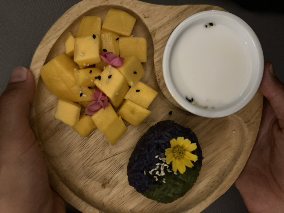 - "An overhead shot captured indoors in Ban Ao Nang, Thailand, depicts a pair of hands presenting a wooden serving platter with a Thai dessert" by FM-DTOSi1, licensed under CC BY 4.0