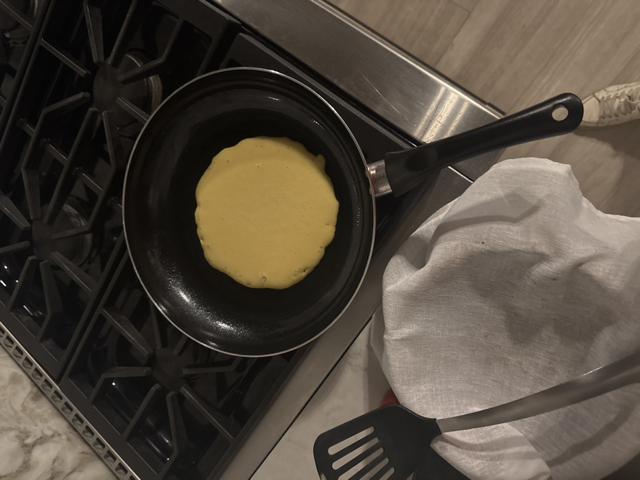 The image displays a kitchen scene from an overhead perspective. A black non-stick frying pan, containing a single, round, yellow pancake with an uncooked top surface, is positioned on a gas stovetop. The stovetop is dark-colored, featuring black cast-iron grates over at least two burners. To the left of the frying pan, a black slotted spatula rests on a crumpled white kitchen towel, both situated on a light-colored countertop. A silver-toned appliance, possibly an oven or dishwasher, is visible beneath the stovetop on the right. Light-colored flooring is present in the lower right, where a person's foot, clad in a light-colored sneaker, is partially visible. No discernible features within the image indicate a specific location within the city of Palmetto Bay, United States.
