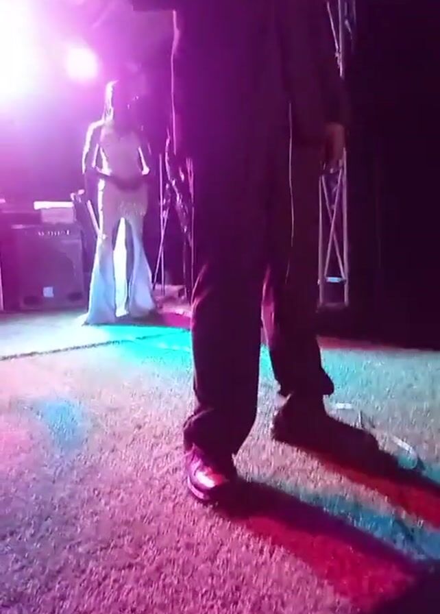 A man wearing a dark suit, red bow tie, and sparkly trim is speaking into a microphone on a stage. A woman in a sparkly white dress stands in the background. Stage lights shine on the performers. The stage has artificial turf. There are speakers and other equipment visible on the stage.