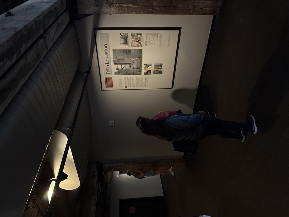 A framed exhibit on "Rifle Location" hangs on a wall in a dimly lit museum setting. A woman and a child stand viewing the exhibit. Exposed wooden beams and ductwork are visible on the ceiling and upper wall. A lamp with a white shade illuminates the area. Another individual is visible in the background, near a doorway. The floor is a dark color.