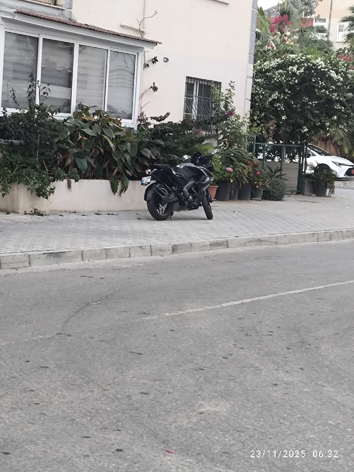 A black motorcycle is parked on the sidewalk in front of a building with lush greenery. Potted plants line the walkway. A white car is visible in the background. The street is in the foreground, occupying a significant portion of the frame. The photo appears to have been taken from a slightly low angle. The date stamp at the bottom right corner reads "23/11/2025 06:32."