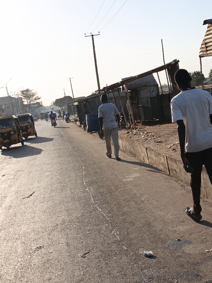 The image depicts a street scene in Tudun Murtala, Nigeria, under clear daylight conditions with long shadows suggesting early morning or late afternoon