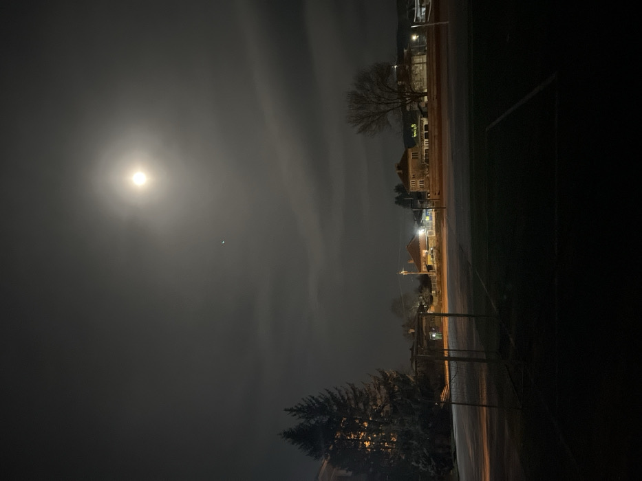 The image depicts an outdoor night scene in Dolni Chiflik, Bulgaria, captured from a low vantage point looking towards a distant horizon. In the immediate foreground, a dark, flat surface with faint white lines, characteristic of a sports court or field, occupies the lower half of the frame. A single metal goalpost, rectangular in shape and lacking a net, is visible on the left side of this field. Beyond the field, in the midground, is an open area or street. To the left, two tall coniferous trees stand, their lower branches subtly illuminated. The background features several buildings, likely residential or small commercial, exhibiting illuminated windows and exterior lights. One prominent building with a light-colored facade is visible toward the center-right, and a bare deciduous tree with thin branches stands to its right. Multiple streetlights are active, casting localized pools of illumination onto the ground and structures. The sky is predominantly dark and overcast, with layers of clouds. A bright, circular moon is prominent in the upper center of the frame, piercing through the cloud cover and emitting a significant glow, creating a faint halo effect. A distinct, small green light source or artifact is observed below and slightly to the left of the moon's central luminosity. No individuals or specific actions are discernible within the scene.