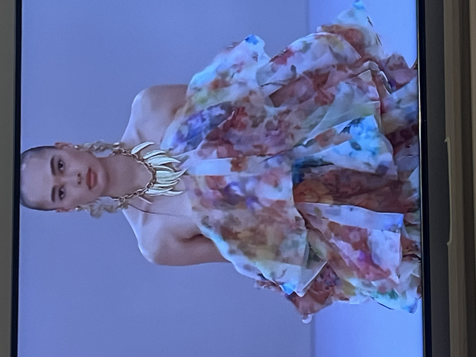 A person is centered in the image, facing forward. They have short hair and are wearing statement gold jewelry, including a necklace with leaf-like pendants and large, ornate earrings. The individual is wearing a voluminous, floral patterned garment with layers of ruffles or pleats in watercolor shades of white, blue, brown, and purple. The background is a plain, light blue or gray. The image is rotated slightly clockwise.