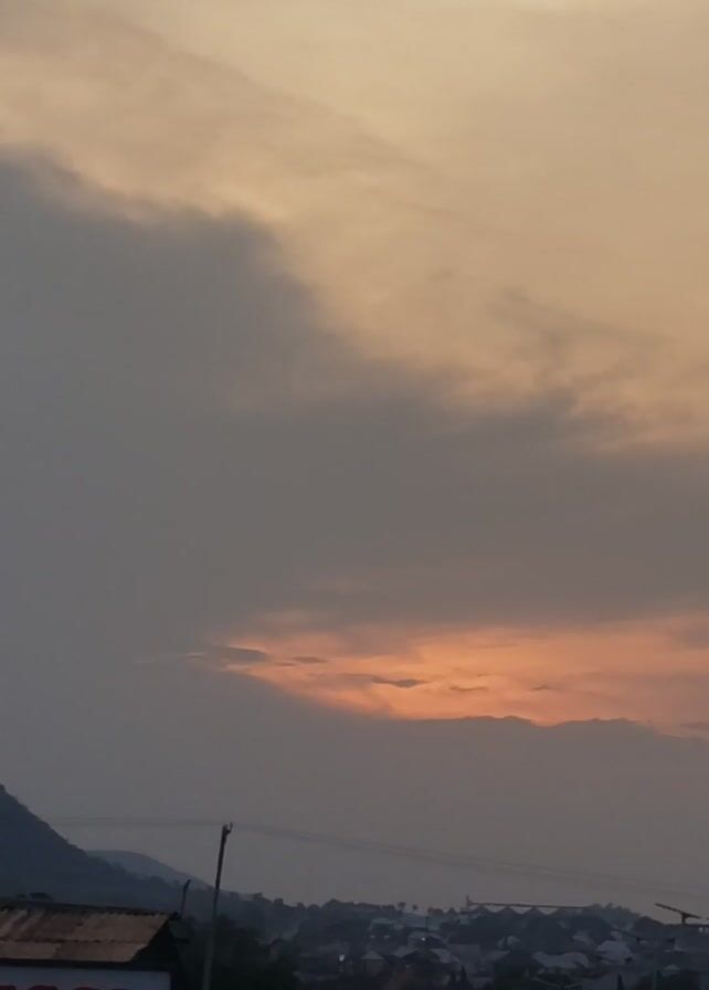 The video depicts an outdoor scene at dusk or dawn. A sky filled with clouds, predominantly grey, with a streak of orange-tinged cloud is visible. The horizon is lined with buildings and trees, creating a silhouette against the light. A road with vehicle traffic runs along the base of the frame. On the right side of the frame, there's a sign for Jessi Model Academy, indicating a school. The camera seems to be handheld and the video is rotated sideways.