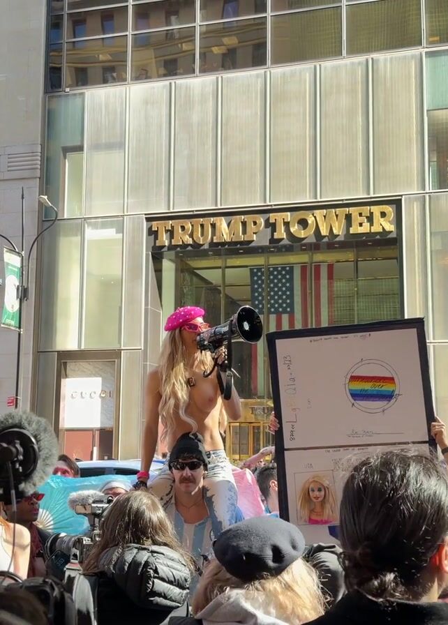 A person wearing a pink headband stands on a platform in front of a crowd. The person is speaking into a megaphone. The crowd is holding up signs. The Trump Tower building is in the background. The person is talking about presidential elections.