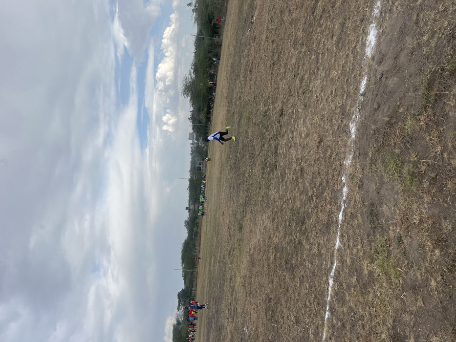 A wide shot of a dry, grassy field, possibly a sports field, with a white line marking the edge. A person in a white and blue shirt is performing a backflip in the middle of the field. Other people are gathered along the edge of the field, likely spectators or participants. The sky is cloudy with patches of blue visible.