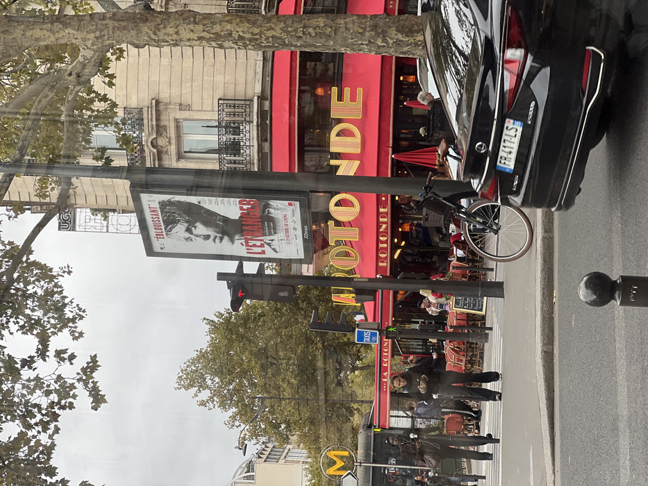 The image depicts an urban street scene in Paris, France, specifically at the intersection near the La Rotonde brasserie in Montparnasse. The foreground shows the rear of a black Lexus sedan with French license plate FR 417-LS, partially obscuring a black bicycle. Faint reflections on the viewing pane suggest the image was taken from inside a vehicle or building. Dominating the mid-ground is the La Rotonde restaurant, characterized by its bright red awning bearing "LA ROTONDE" in large yellow capital letters. An outdoor terrace with numerous red tables and chairs is occupied by several patrons. To the left of the restaurant, a Paris Metro "M" sign is visible, along with a traffic light displaying a red signal. Adjacent to the traffic light, a large vertical billboard features a movie poster with a black and white close-up of a man's face. The poster's prominent text reads "L'ÉTRANGER" (The Stranger) in red, indicating an October 29th cinema release. On the crosswalk in the mid-ground, two individuals are prominent: one tall, dark-skinned person wearing a brown jacket, holding a white cup and looking at a phone; and another fair-skinned person with dark hair, wearing a black hooded top and dark pants, also engrossed in a phone. Multiple other pedestrians and cafe patrons are visible in the background. The surrounding environment includes classical Parisian buildings with stone facades and wrought iron balconies, alongside deciduous trees exhibiting green and yellow foliage under an overcast sky.