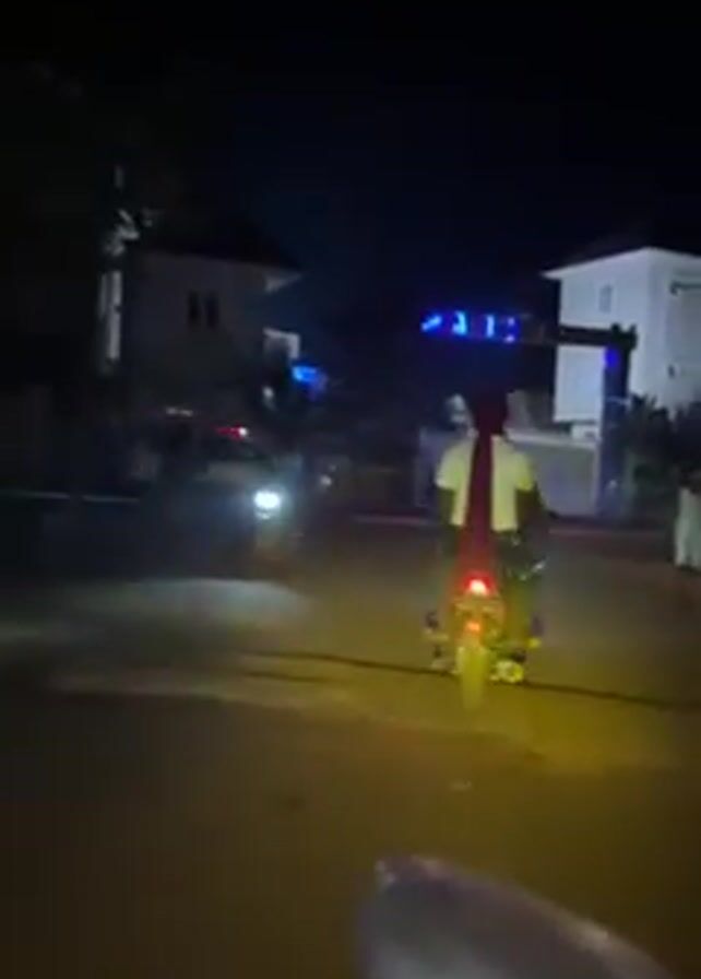 At night, a person rides a small motorbike with a yellow headlight and taillight down a street. There are cars parked on the side of the street and buildings on either side. One of the buildings has blue lights on it. Other people are visible standing around. The person holding the camera appears to be moving on the street as well.