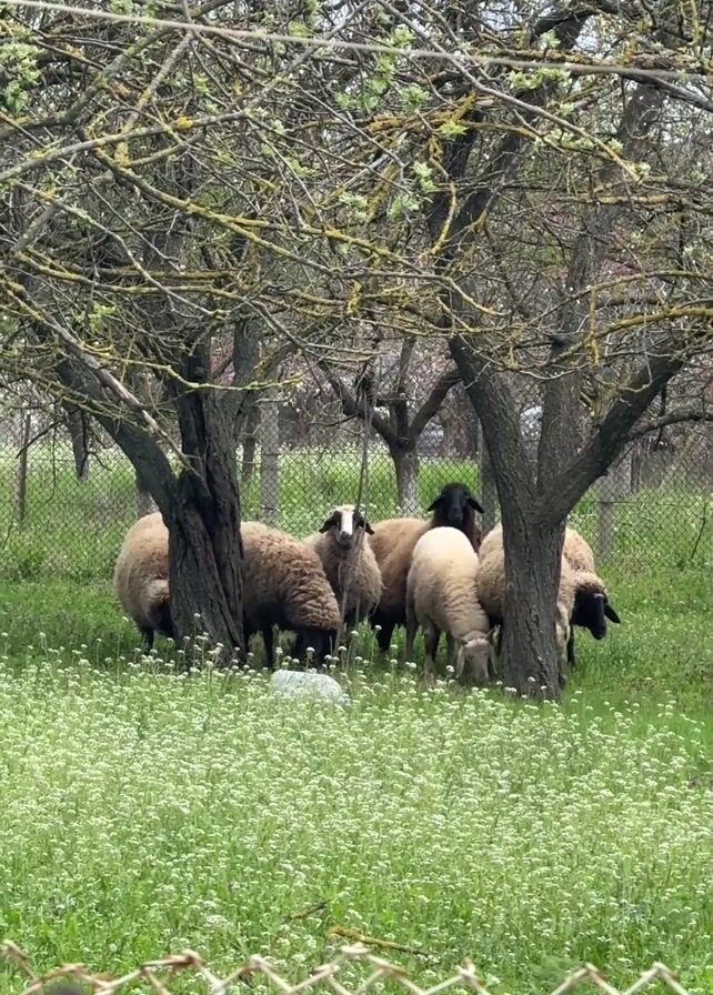group of sheep grazing under trees in a grassy area dotted with small white flowers. The sheep are of varying colors, including brown, black, and white. The trees are mostly bare, with some budding leaves, and a metal fence surrounds the area. A person speaks briefly, out of frame, at the beginning of the video.