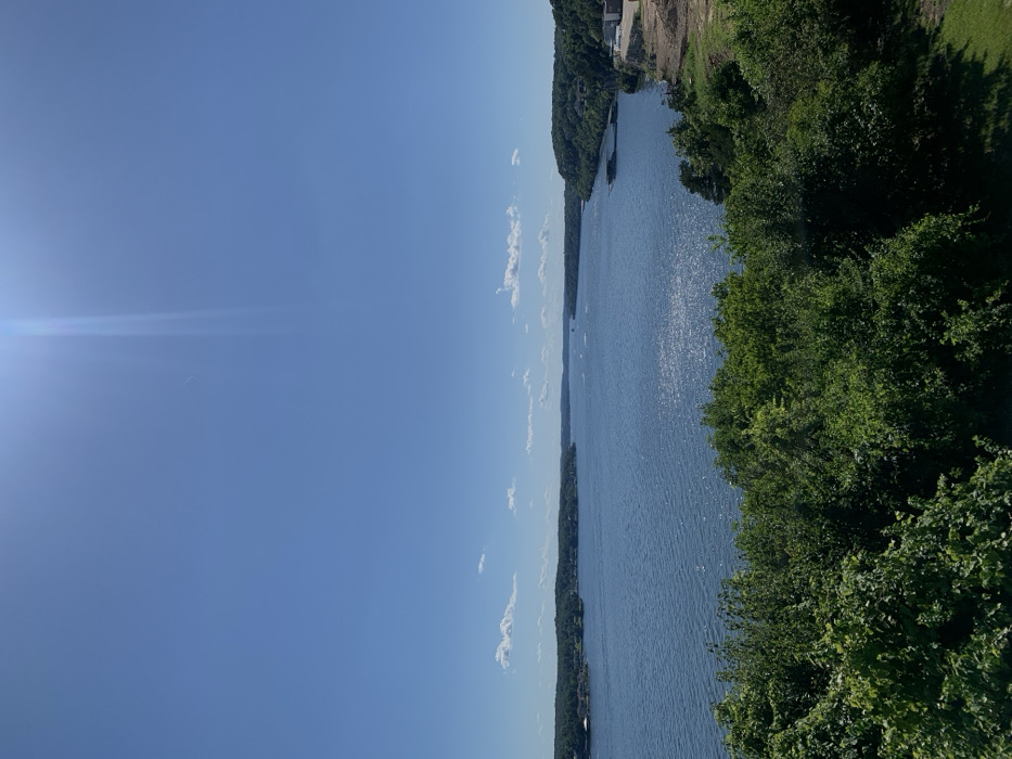An elevated panoramic view depicts a wide section of the Lake of the Ozarks in the city of Lake Ozark, United States, under clear daylight conditions. The upper half of the image is dominated by a bright blue sky with a few scattered white cumulus clouds. A prominent sun flare emanates from the upper right quadrant of the sky. The central and largest feature is the deep blue water of the lake, which stretches horizontally across the mid-ground. The water's surface exhibits strong glints of sunlight, indicating ripples or small waves. Faint wakes are discernible on the water, suggesting the presence or recent passage of watercraft, though no boats are clearly visible. The foreground is filled with dense, lush green deciduous trees and foliage, obscuring the immediate ground beneath the viewpoint. The distant shorelines on both the left and right are heavily forested with green trees. On the far left distant shore, indistinct structures, possibly residential buildings or docks, are visible nestled amongst the trees at the waterline. On the far right distant shore, a section of exposed earth and rock, indicative of a cleared area or construction site, is visible, with some darker structures or platforms extending into the water nearby. No individuals or direct human activities are visible within the frame.