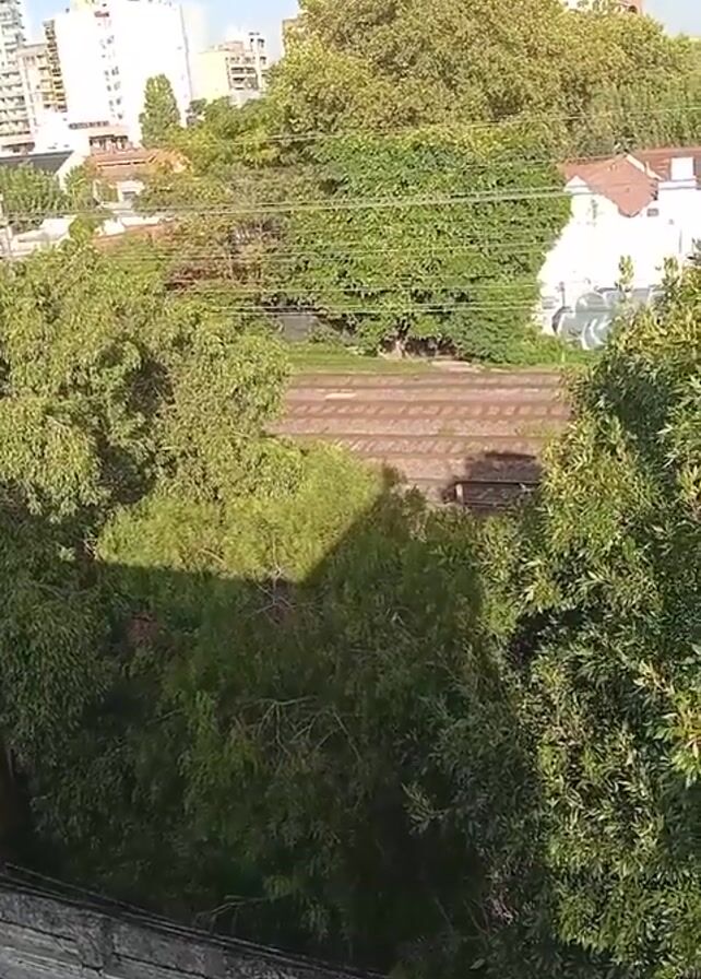 n elevated view looking out over a neighborhood with dense green trees and vegetation in the foreground. In the midground, a set of train tracks runs horizontally across the scene, surrounded by more greenery. Beyond the tracks, a residential area is visible with buildings of varying heights, including some tall, white apartment buildings. The sky is partly cloudy, suggesting a bright day. The camera appears stationary, capturing the scene from a height, potentially from a building or balcony.