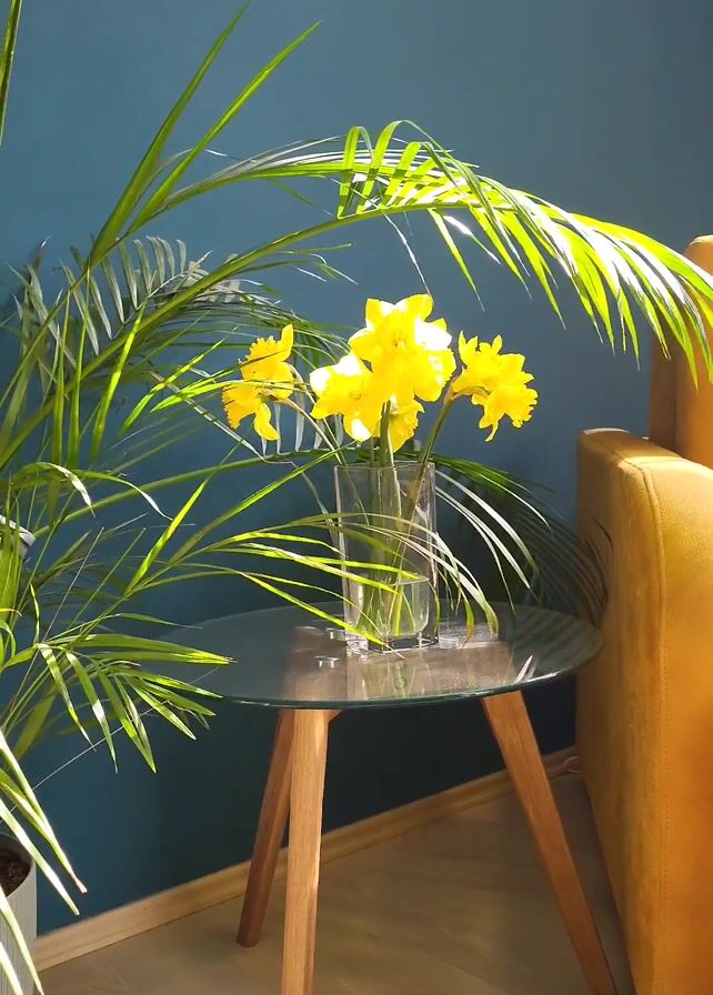 The shot is of a small glass table with a vase of yellow daffodils, positioned between a potted palm and a mustard-colored couch. The table has a clear round top and four light wooden legs. The daffodils are in a simple, clear glass vase. The palm plant has long, thin green fronds. The couch is a mustard-yellow color and appears to be made of a soft material. A deep teal wall provides the backdrop. Sunlight streams into the scene, highlighting the palm and the daffodils. The camera slowly pans upwards, revealing a light-colored wooden cabinet above the wall. An orange tablet is also visible.