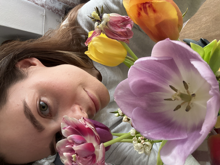 - "One female individual, light-skinned with brown hair, is partially visible, positioned behind a bouquet of cut flowers" by FM-kRQMq1, licensed under CC BY 4.0