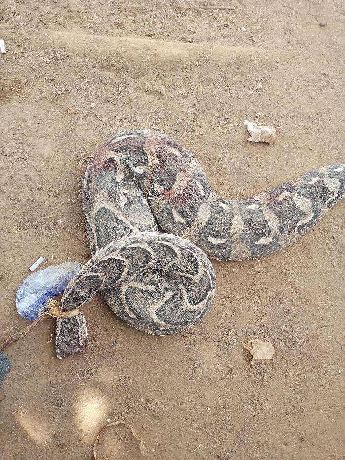 - "The scene is captured at Oduma Hill, Nigeria, displaying an overhead view of a deceased or incapacitated large snake resting on dry, sandy-brown earth" by FM-kquCH2, licensed under CC BY 4.0