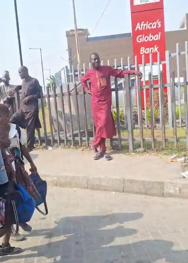 street scene with several people and a yellow three-wheeled vehicle. Three men are standing near a metal fence. One is wearing a red outfit, another a brown outfit, and the third a light beige outfit with a hat. They appear to be conversing. The yellow three-wheeled vehicle, possibly a tricycle or auto rickshaw, is parked nearby. It has a black roof and visible license plate. The vehicle has "TVS" and "KE PLUS" printed on it. A man and a child pass in front of the camera. The man is wearing a blue shirt. In the background, there is a bank sign that says "ATM Africa's Global Bank" and a building labeled "KABANGA." The ground is paved with gray bricks. The sky is clear and bright.