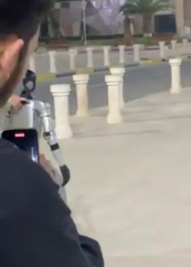 A video captures a humanoid robot walking on a sidewalk at night