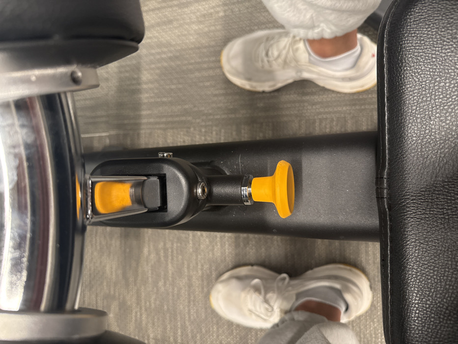 An overhead shot reveals gym equipment: a black bench with a yellow adjustment knob on its side. Parts of the padded seat are visible, along with a shiny metal support. Two feet in white sneakers, with white socks, are standing on the grey patterned floor around the equipment. The focus is primarily on the adjustment mechanism and surrounding structural details.