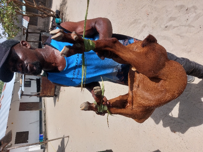 A dark-skinned man stands outdoors in a sandy area of Dar es-Salaam, Tanzania. He wears a black baseball cap and a blue sleeveless shirt, and has a short beard. The man holds a live, reddish-brown goat upside down by its legs, which are bound together with green fibrous plant material. His expression is neutral, and his skin appears moist. In the background, a single-story white building with a rusty corrugated metal roof and a brown wooden door is visible. To its right, a smaller, unpainted structure, possibly a kiosk, made of corrugated material or wood, stands amidst sparse vegetation. The ground is light brown dirt or sand, displaying pronounced shadows under bright sunlight.