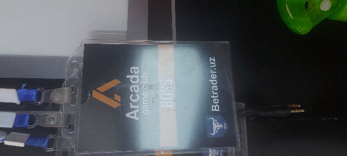 A badge holder displays an ID card. The card features a logo with "Arcada game club" and the text "BOSS" in a bold font, separated by a light band. To the right, it reads "Betrader.uz" above an emblem with a bull. The badge is attached to a lanyard with blue and white fabric. Part of a green object appears in the upper right corner.