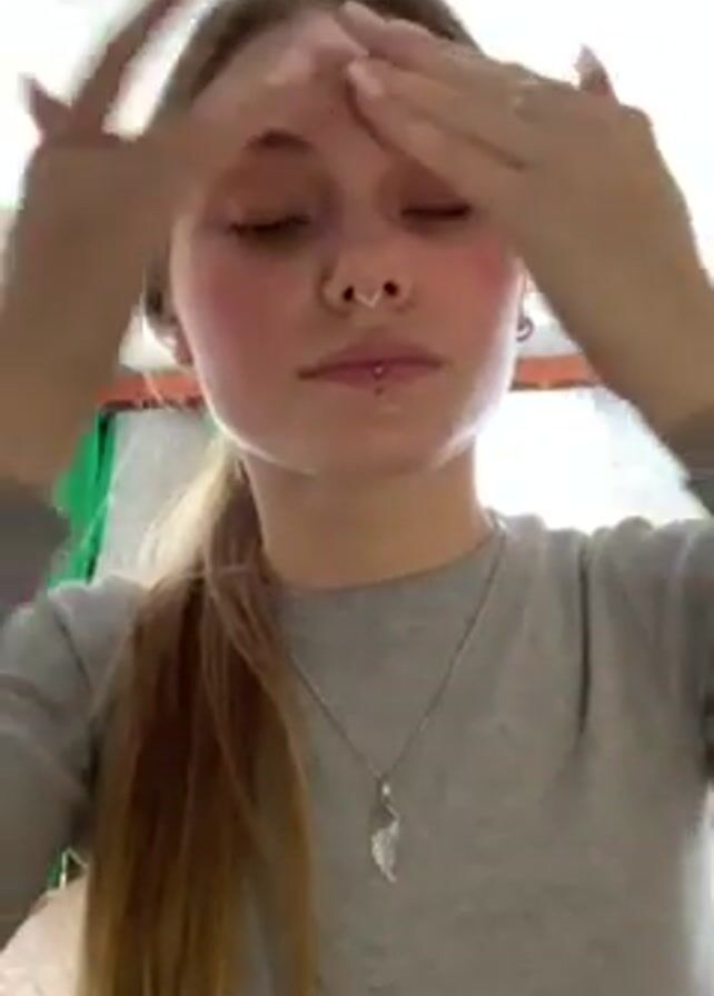 A young woman with light skin and blonde hair pulled back into a ponytail is applying lotion to her face in an indoor setting. She has a nose ring, a lip piercing, and wears a gray long-sleeved shirt with a silver necklace featuring a wing pendant. She begins by rubbing lotion across her forehead with both hands, then moves down to her cheeks and chin, massaging the product into her skin. The background is slightly blurred, showing a window with a green curtain and part of a patterned wall. The lighting is bright, and the camera angle is from a low perspective, looking up at the woman.