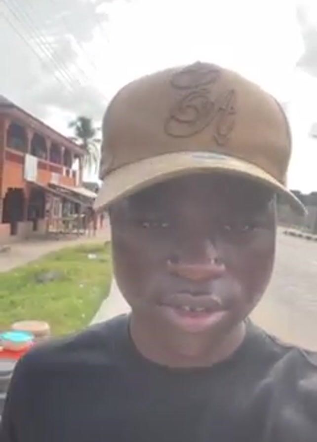 A young man in a black T-shirt and a tan baseball cap is taking a selfie video. He is outside on a street near a building, a table with items, and a motorcycle driving by. The weather appears overcast. The man is speaking, but the audio is unclear.