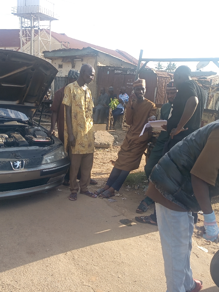 - "An outdoor scene in Unguwar Shanu, Nigeria, depicts a group of men gathered around a silver-grey Peugeot sedan with its hood open, indicating mechanical inspection or repair" by FM-sjbDs2, licensed under CC BY 4.0