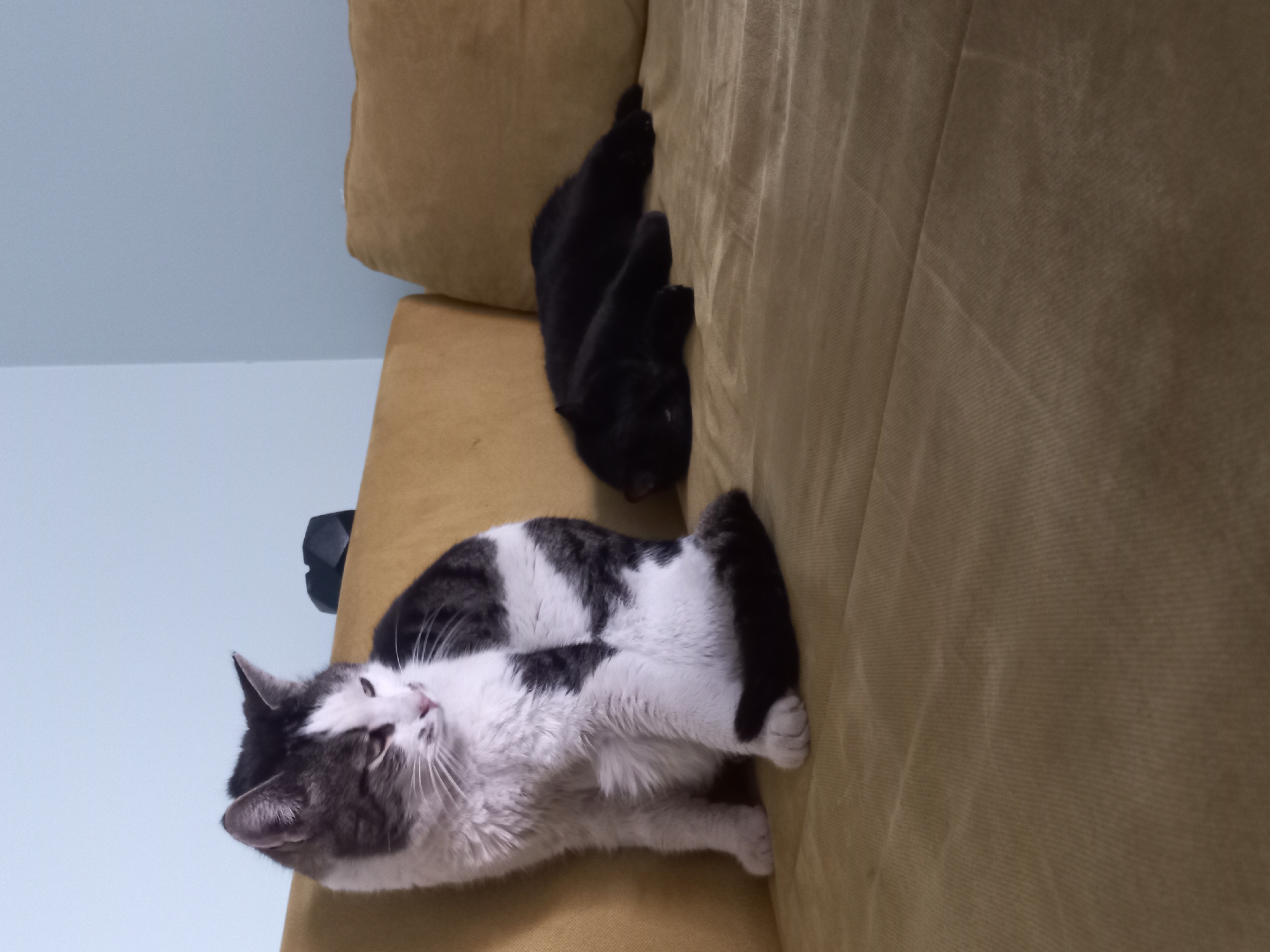 A horizontal shot depicts two cats resting on a beige couch. The first cat, closer to the foreground, is white with gray and black patches. It lies on its back with its paws extended. Its eyes are open. Behind it, a black cat is positioned near the couch's corner, seemingly curled up against a pillow. The couch fabric appears textured, and the background reveals a light blue wall. The scene is indoors and lit by artificial light. The location is unknown.