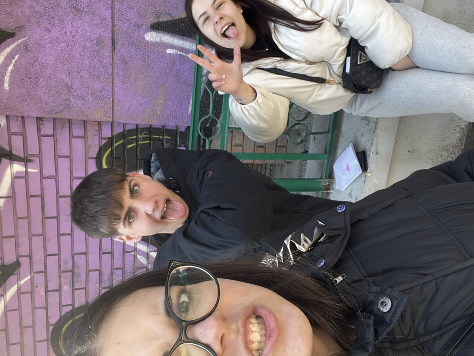 Three individuals are captured in a close-up outdoor photograph in the city of Bankya, Bulgaria