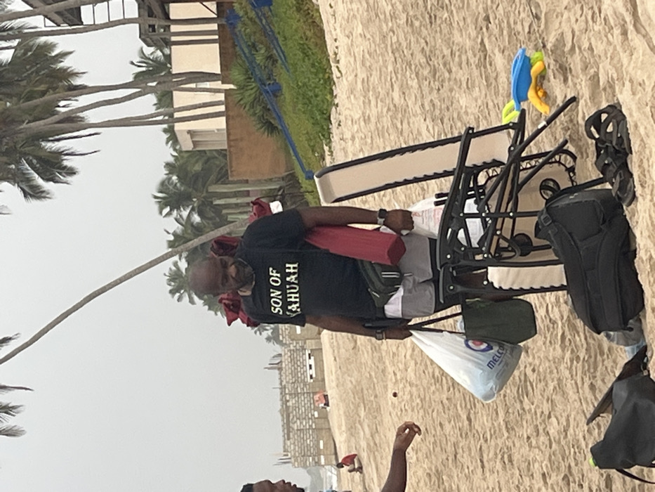 An adult male with a dark complexion, balding head, and beard stands on a sandy beach in Kasoa, Ghana, under an overcast sky