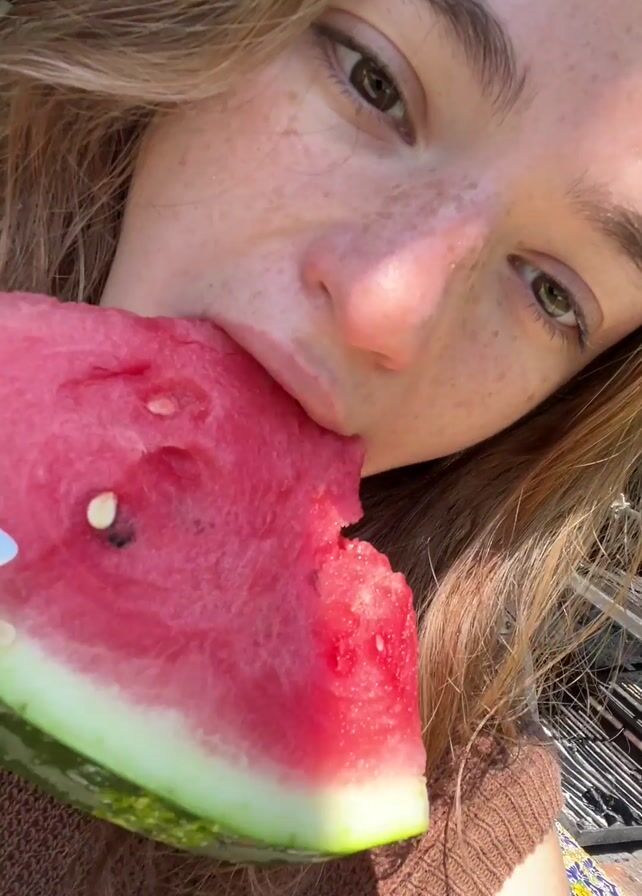A young woman with freckles eats a piece of watermelon in an outdoor setting. The camera is close to her face, capturing her facial expressions. She takes a bite, chews, and then purses her lips. She is wearing a brown sweater. The background is somewhat blurred, but elements of an outdoor patio or deck are visible.