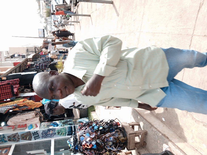 The image depicts an outdoor street scene in Plumtree, Zimbabwe, under bright daylight. A bald, dark-skinned male, wearing a light green long-sleeved shirt and blue jeans, is prominently featured in the foreground, walking towards the viewer's right while looking directly at the camera. His right hand is raised to his chest level. To his immediate left, a display rack densely packed with multi-colored sunglasses is positioned on a small wooden stool. Behind this, a storefront with a visible "TILDE" sign displays various garments, including patterned dresses and scarves. Another dark-skinned individual, wearing a white shirt and a dark head covering, is partially visible behind the main subject, facing away. The mid-ground and background reveal a busy street with additional storefronts, one marked "NURT WEAR," and numerous pedestrians walking on the wide, reddish-brown pavement sidewalk. Vehicles are parked alongside the street.