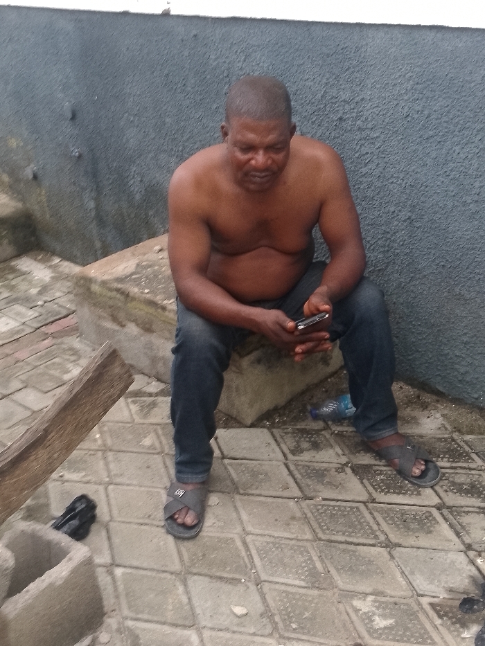 An adult male with dark skin and short, dark hair is depicted seated outdoors. He is shirtless, wearing dark blue jeans and dark grey slide sandals. The individual holds a black smartphone in both hands, looking downwards at the device. He is seated on a low, weathered concrete structure, possibly a bench or ledge. Behind him is a dark grey, textured wall with a lighter top trim. The ground is paved with light grey interlocking concrete pavers arranged in a diamond pattern. A clear plastic water bottle with some liquid is visible on the ground near his right foot. In the lower-left foreground, a wooden plank rests diagonally, and two stacked concrete blocks are present, alongside a pair of black sandals or flip-flops. The specific location within the city of Unknown, Unknown cannot be determined from the provided image.