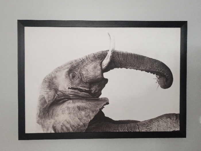A framed, black-and-white photograph of an elephant hangs on a light gray wall