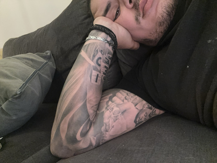 An indoor scene features a male subject lying on a dark grey fabric sofa or bed. The subject's upper torso, head, and right arm are depicted. He is positioned on his side, resting his right hand against his right cheek, with his eyes open and directed towards the viewer. He exhibits stubble on his chin and jawline and wears a dark, long-sleeved garment. On his right wrist are two bracelets: a black braided cord and a silver-colored link bracelet. His right arm is covered by an extensive black and grey sleeve tattoo, which includes classical figures or statuary on the upper arm and elbow, and abstract or textual elements on the forearm, such as visible characters resembling "C," "E," and "I." A dark grey cushion with a vertical zipper is partially visible to the left of the subject. The background is a plain, light-colored wall. The specific location within Sofia, Bulgaria, cannot be determined from the image.